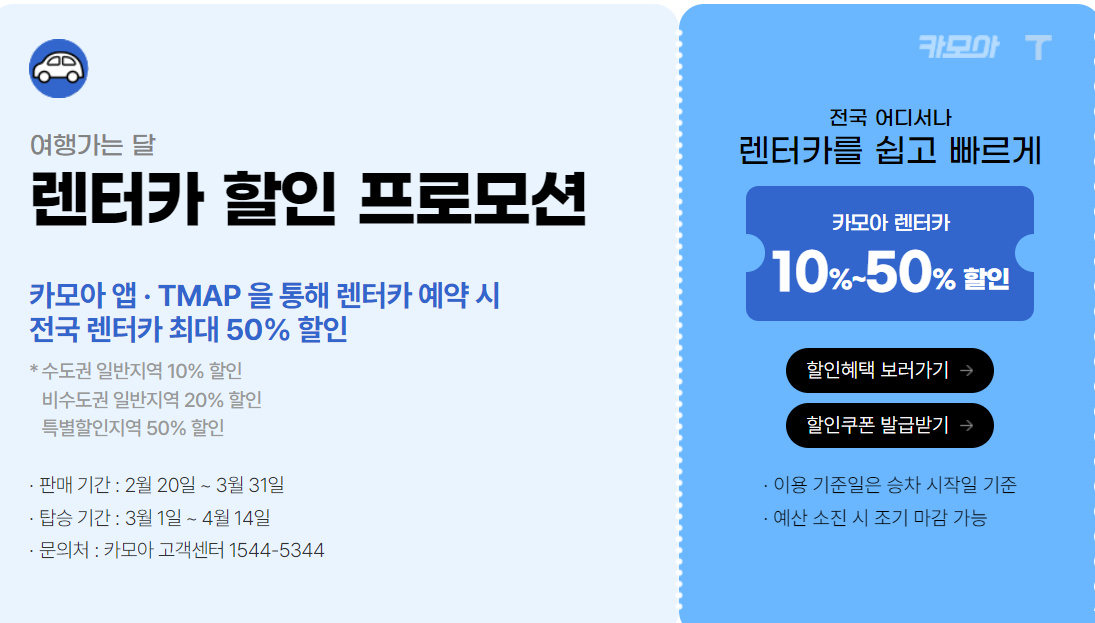 렌터카 할인은 카모아 앱 · TMAP 을 통해 렌터카 예약 시 전국 렌터카 최대 50% 할인, 수도권 일반지역 10% 할인, 비수도권 일반지역 20% 할인, 특별할인지역 50% 할인받을 수 있습니다.