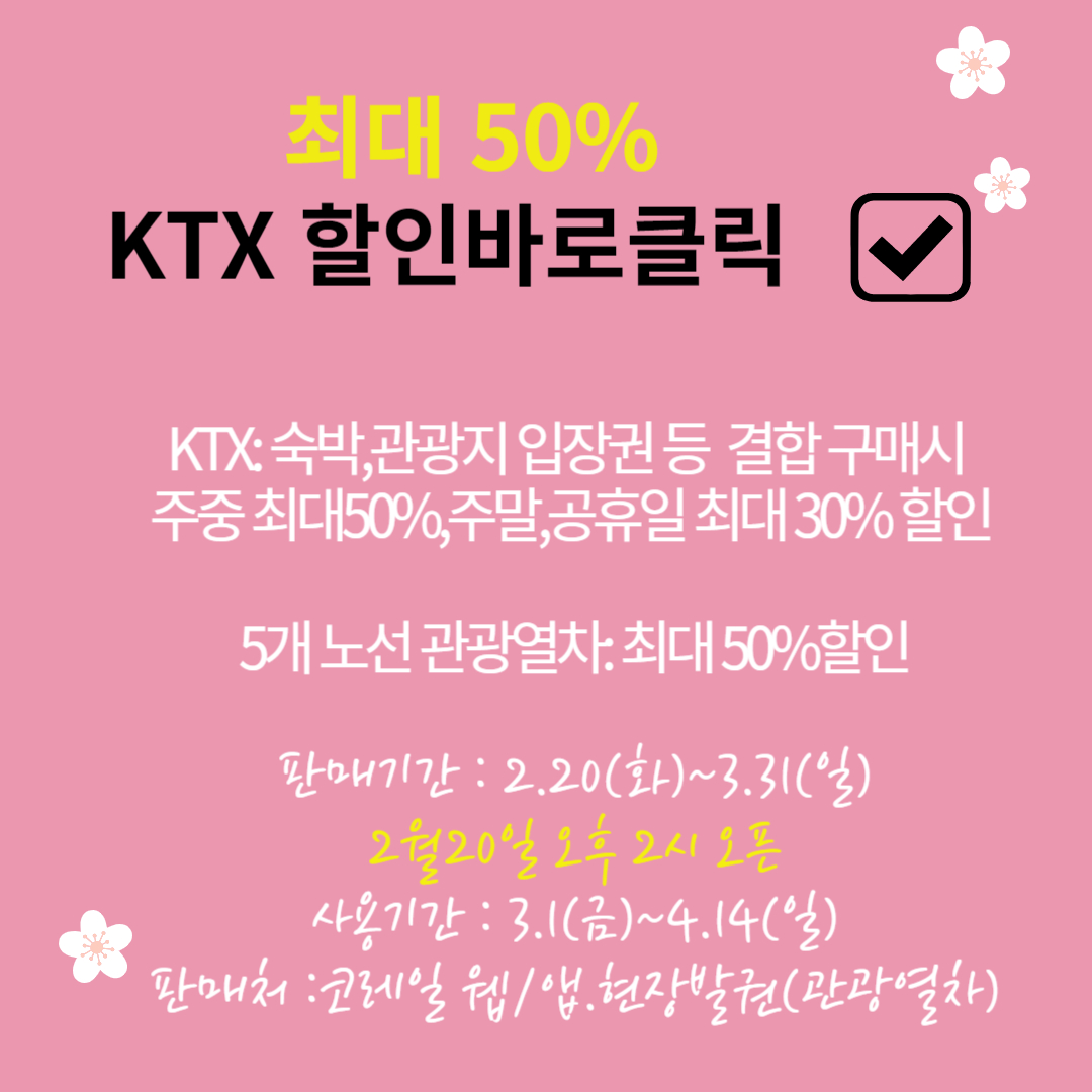문의는 한국 철도공사 고객센터(1544-7788), 전국 KTX역 여행센터 더 자세한 내용은 아래 링크에서 확인헤 보세요. 정해진 예산 소진 시 조기마감합니다. 아래 링크를 클릭하시고 여행 계획을 세워보세요.