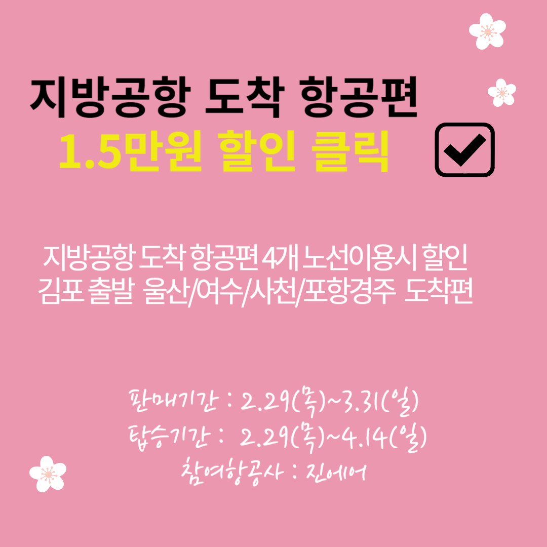 비행기를 이용하시어 국내 지방여행 즉, 김포에서 출발, 진에에 항공을 이용하시어 울산, 여수, 포항경주, 사천에 여행을 갈 경우 1민 5천 원 할인을 받을 수있습니다. 선착순으로 2월 29일 (목)부터 할인 구매 및 사용가능합니다.