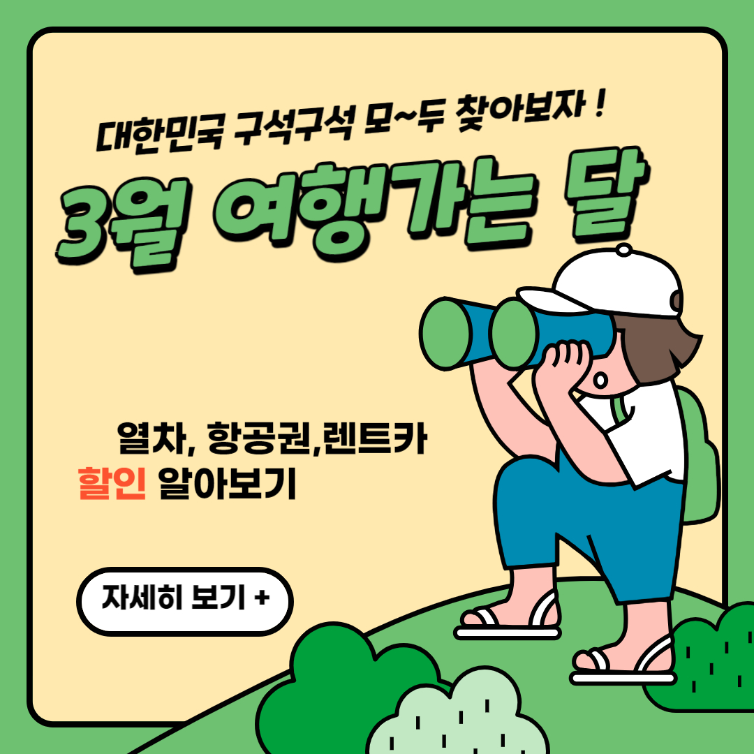3월은 멀리서 봄이 오는 소리가 들리는 봄의 시작입니다. 2월이지만 하루라도 빨리 봄을 느끼고 싶은 여러분들에게 교통,숙박, 다양한 여행지 꿀팁과 다양한 할인혜택과 알찬 정보를 알려드리겠습니다 더 자세한 내용은 아래 링크에서 확인헤 보세요. 예산 소진 시 조기마감됩니다. 이 기회를 지금 잡으세요.