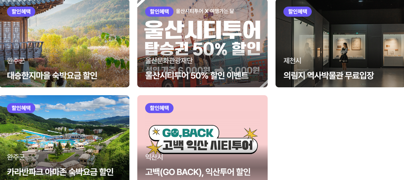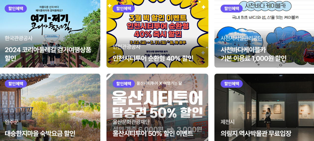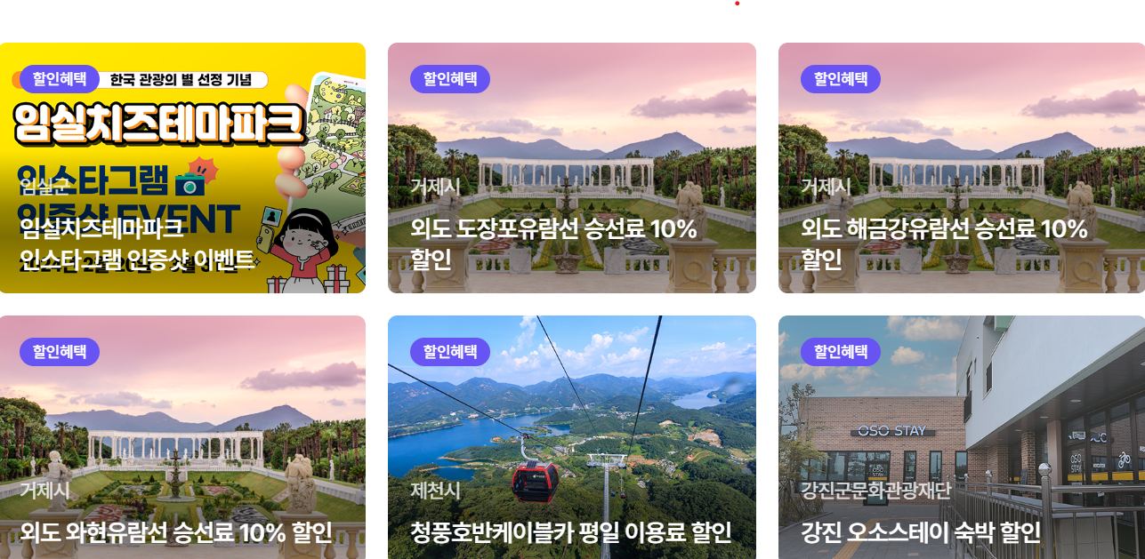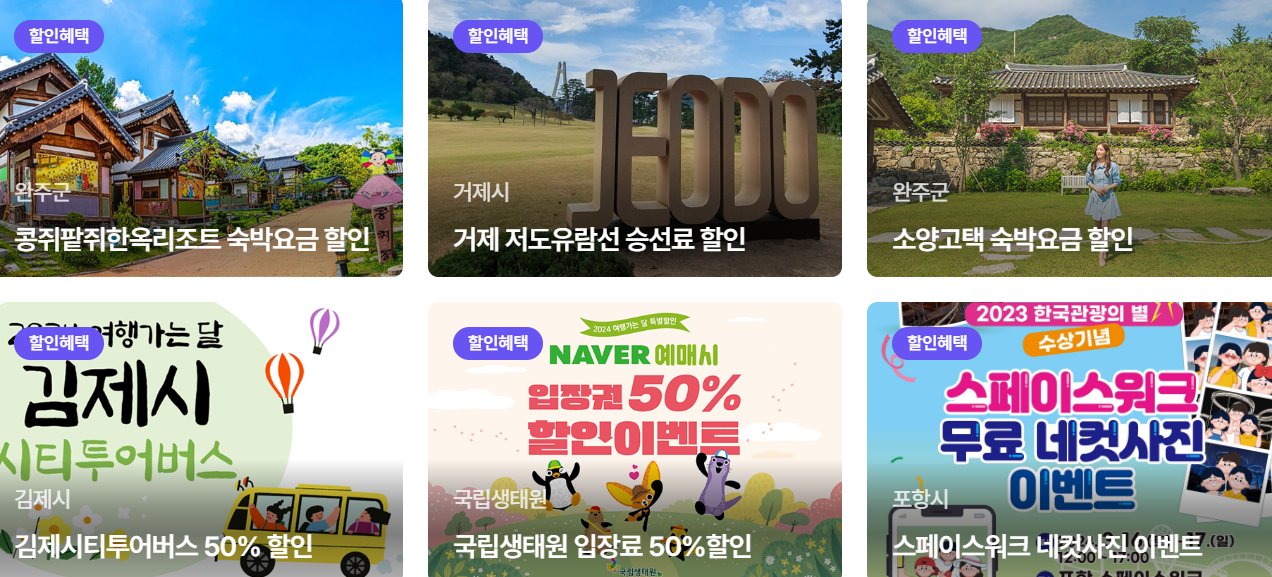 자전거 여행상품 3만 권 할인 및 전통시장 상품권 1만 원 제공/ 템플스테이 최대 50% 할인/해남 오시아노 캠핑장 월요일~목요일 20% 할인 이벤트/외도 장승포유람선승선료 10% 할인 등 다양한 할인 혜택이 있습니다.
