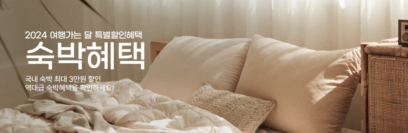 2024년 설 연휴편으로 발급 중인 1차 숙박 시설 할인이 진행 중입니다. 또한 3월, 4월 여행을 위한 숙박 할인 발매가 2월 27일부터 시작입니다. 여행 가는 달 캠페인에 등록된 국내숙박 시설 이용 시 할인 혜택을 받을 수 있습니다.