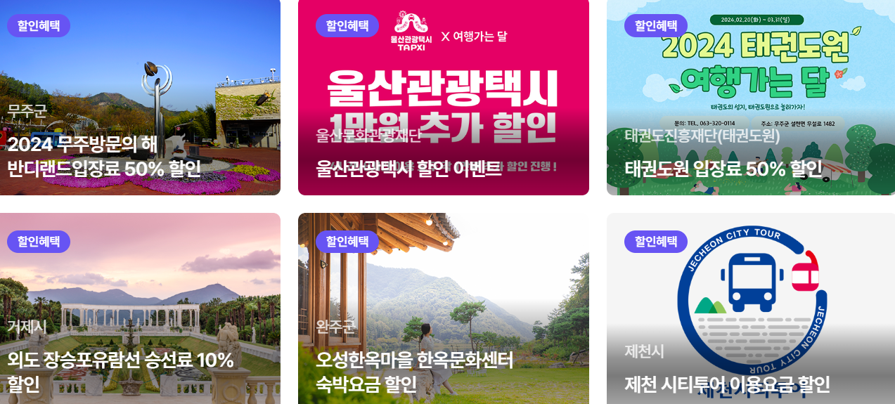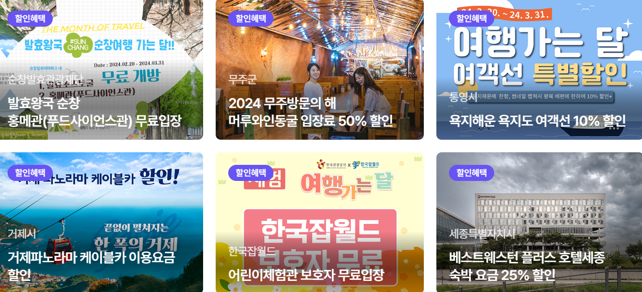 '여행 가는 달'에서 준비한 관광지 입장할인, 다양한 방문 인증 이벤트등 신나고 유익하고 다채로운 혜택을 만껫 누리시기 바랍니다.