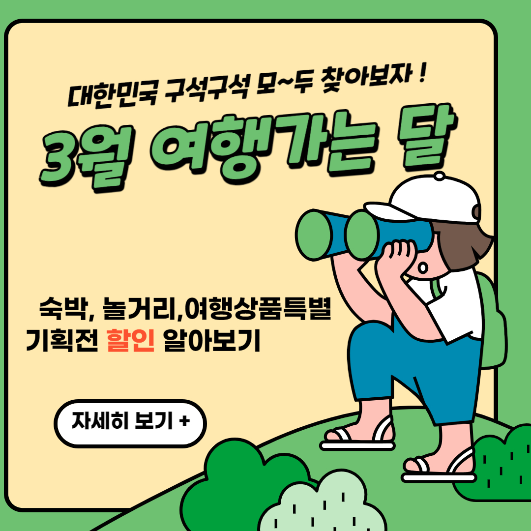 "여행 가는 달"을 들어보셨나요? 문화체육관광부와 한국관광공사가 2024년 2월 20일 ~3월 31일까지 추진하는 캠페인입니다. 사계절 아름다운 우리나라 구석구석, 여기저기를 여행하기 딱 좋은 3월에 기차로, 비행기로 렌터카로 교통비 최대 50%, 국내 여행상품 40% 할인등 다양한 이벤트와 할인이 제공됩니다. "3월 숨은 여행 찾기. 로컬 재발견'이라는 여행 가는 달 표어처럼 설레는 3월에 사랑하는 사람들과 여행을 통해 대한민국 숨겨진 매력을 재발견하며 나 스스로의 매력과 함께 여행을 떠나는 사랑하는 사람들의 매력을 발견하는 시간을 만들어 보시기 바랍니다.