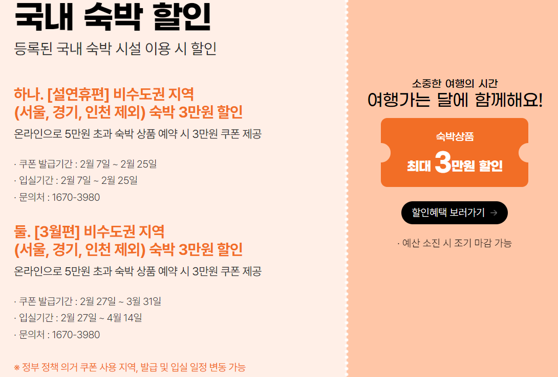 -수도권 지역(서울, 경기, 인천 제외) 숙박 3만원 할인 -온라인으로 5만원 초과 숙박 상품 예약 시 3만원 쿠폰 제공 |